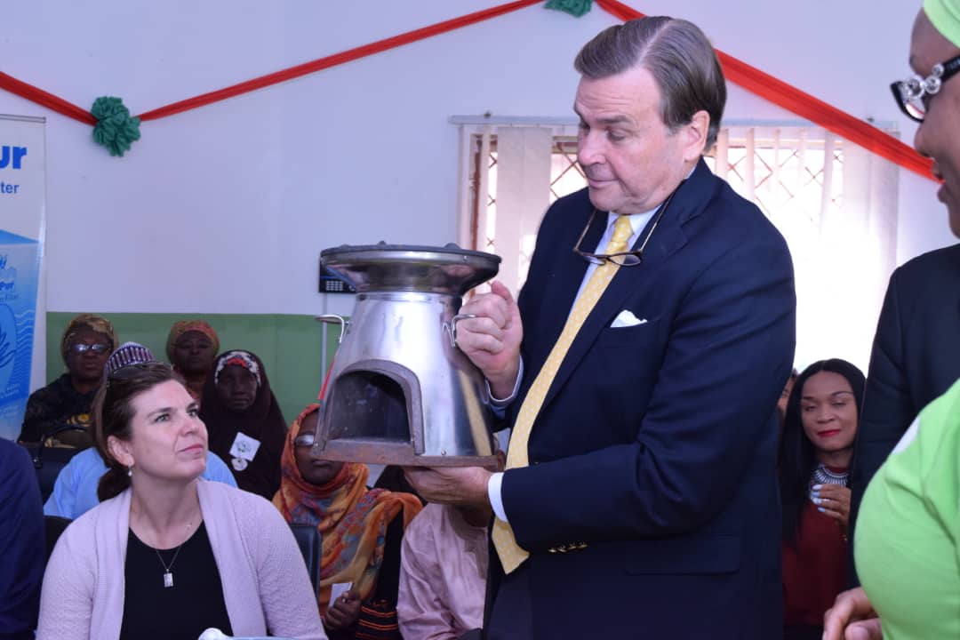 Sosai Renewable Energies Company MD Mrs. Habiba Ali explaining one of the improved cook stoves to the U.S Ambassador.